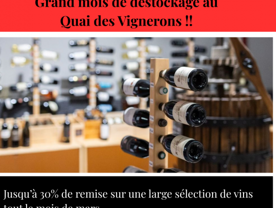 GRAND MOIS DE DÉSTOCKAGE AU QUAI DES VIGNERONS ! Publié le 03 Mar 2026 Le mois de mars s’annonce festif au Quai des Vignerons ! Profitez de remises exceptionnelles jusqu’à -30% tout le mois sur une large sélection de vins